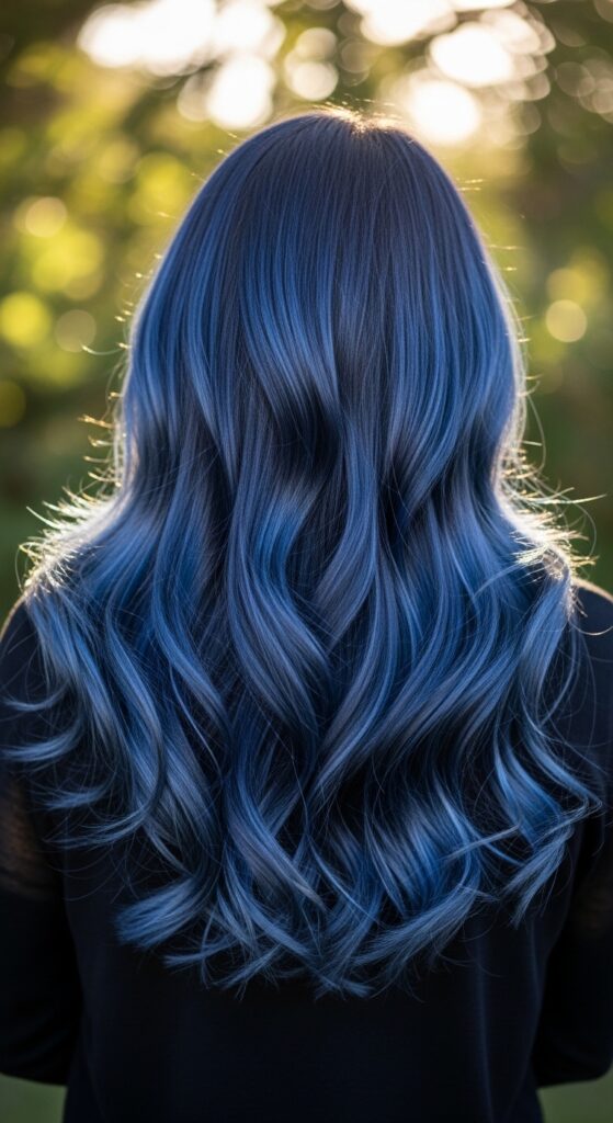 These darker blue tones are ideal for those who want a more understated look. Navy or midnight blue blends seamlessly into dark brown hair, becoming visible mainly in sunlight or movement. This option is perfect for beginners or professionals who want a creative touch without going too bold.