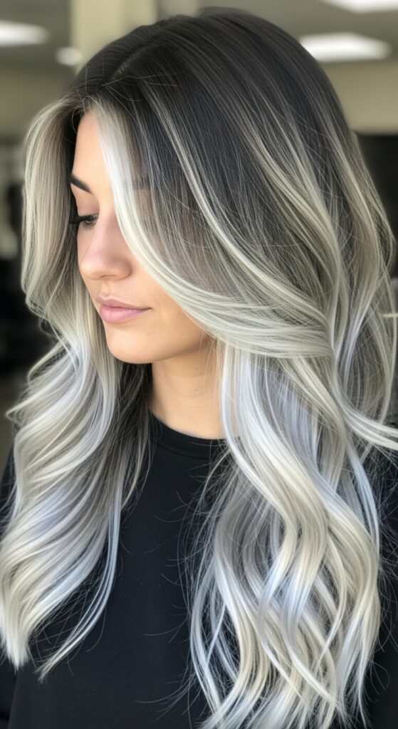 The defining feature of this hairstyle is its ultra-cool, smoky finish, which neutralizes warmth and gives the hair a sleek, modern edge. The gradual fade from dark roots to icy blonde ends keeps the look polished and low-maintenance, allowing for effortless grow-out. Styled in loose, cascading waves, the icy ash tones reflect light beautifully, emphasizing texture and creating a refined, salon-finished appearance suitable for both everyday wear and special occasions.