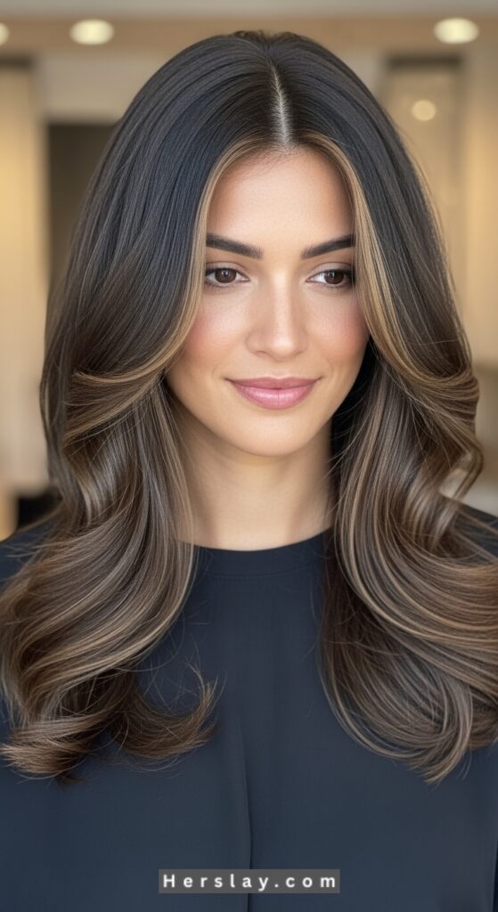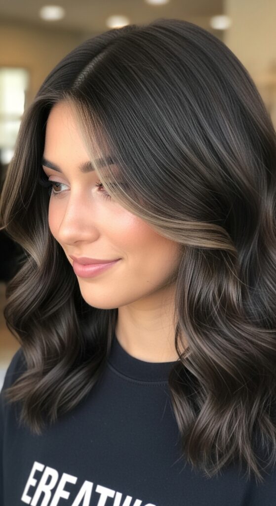 Request finely blended ash brown balayage or foiled highlights on a dark base, toned cool and styled with soft waves to enhance dimension and shine.