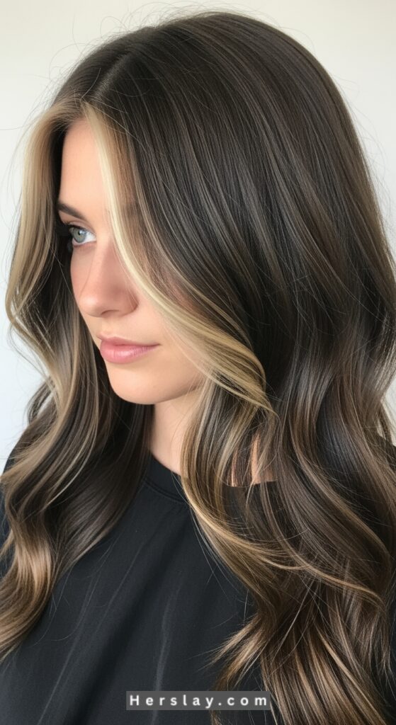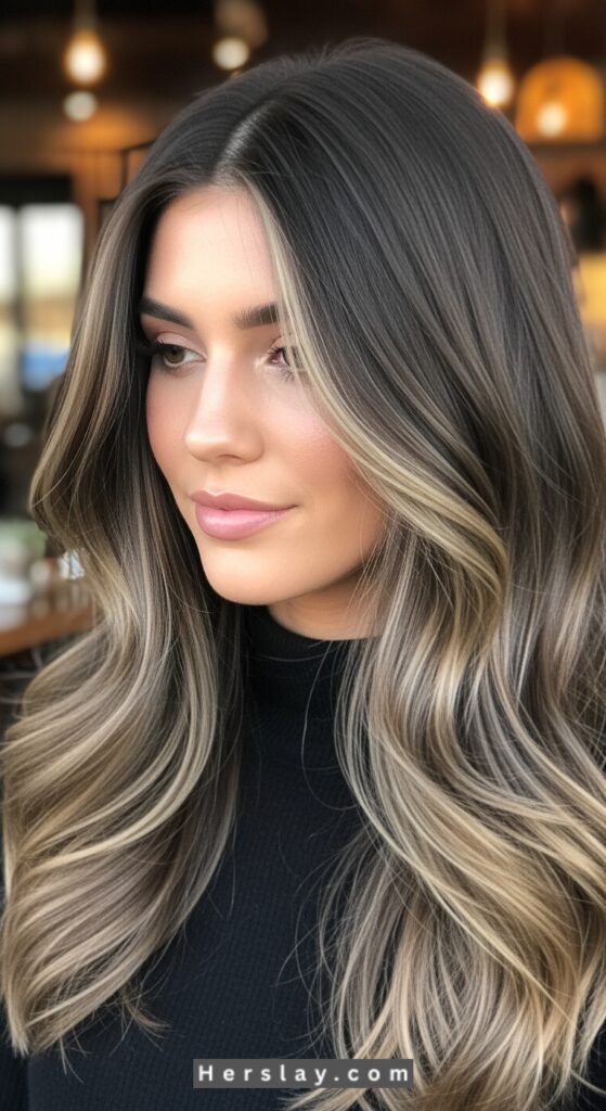 Ask for fine ash blonde balayage or foiled highlights on a dark base, finished with a cool-toned gloss and styled in loose, polished waves to enhance dimension.